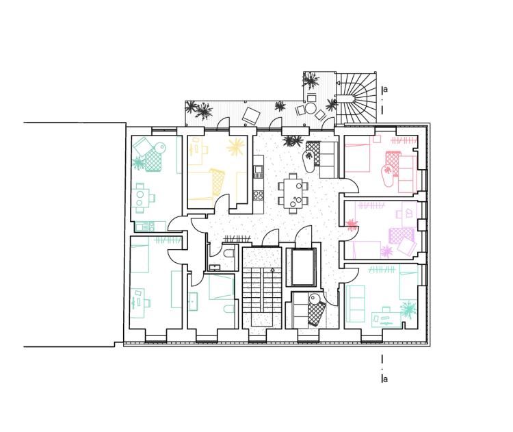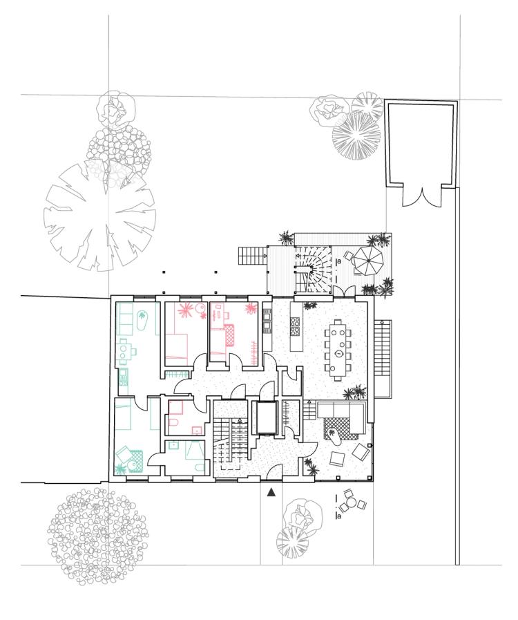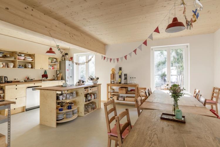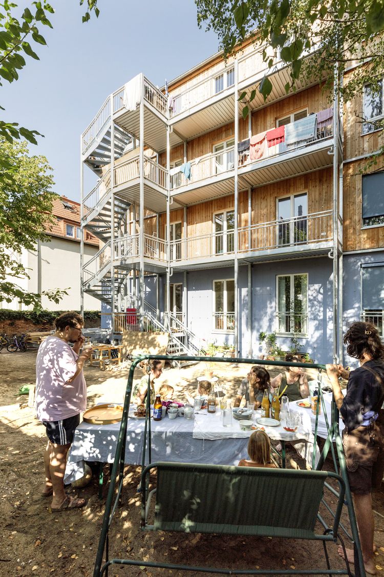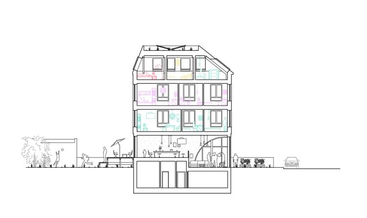 Der viergeschossige Neubau ist als Clusterwohnhaus für mehrere Generationen konzipiert. Die Bewohner:innen verfügen über eigene Schlafräume, während Bäder und großzügige Gemeinschaftsflächen gemeinschaftlich genutzt werden. Mittelpunkt des Hauses ist ein offener Wohn- und Küchenbereich im Erdgeschoss, der als Treffpunkt für die Hausgemeinschaft und für nachbarschaftliche Aktivitäten dient.