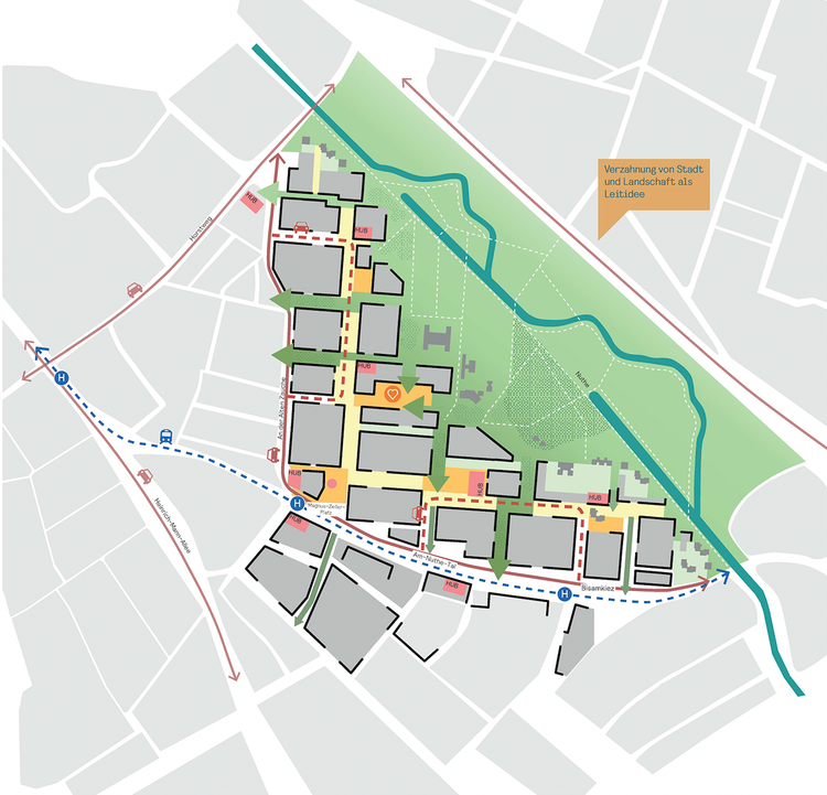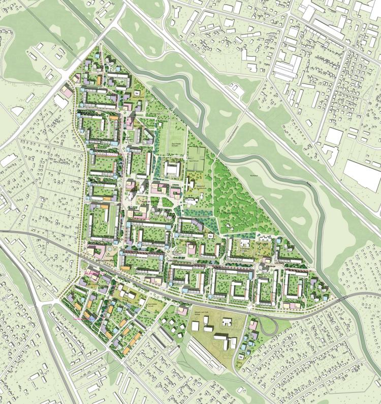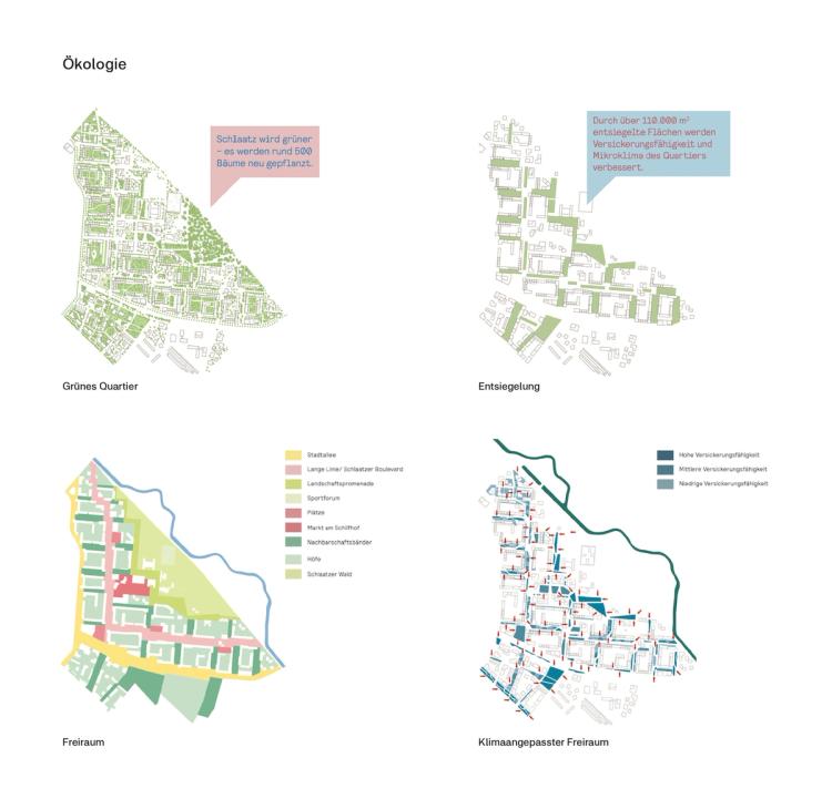 Zentrales Element war die Neuordnung der Verkehrsflächen zugunsten einer blau-grünen Infrastruktur. Verkehrsberuhigte Erschließungsloops reduzierten den Durchgangsverkehr und stärkten Orientierung, Sicherheit und Aufenthaltsqualität. Bestehende Blockstrukturen wurden sensibel ergänzt, um klare Stadträume sowie eine differenzierte Hierarchisierung öffentlicher und privater Freiflächen herauszuarbeiten.