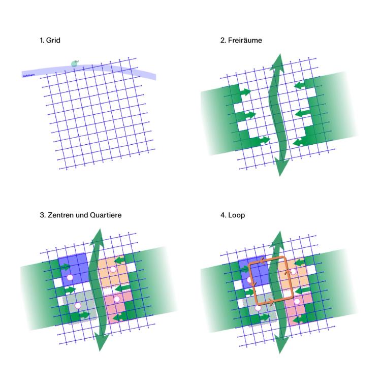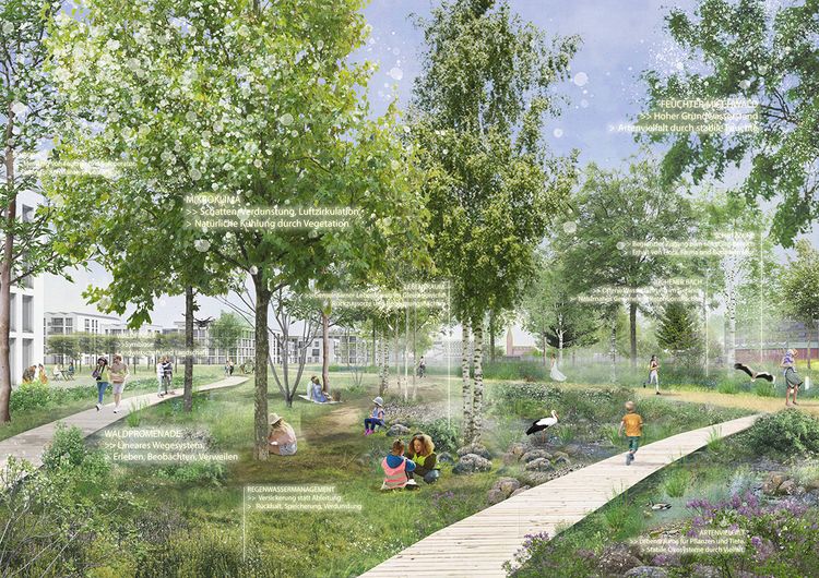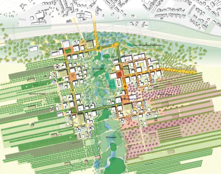 Die räumliche Ordnung folgte dem Prinzip Forest first. Vegetationsstrukturen bestimmten Erschließung, Parzellierung und Bebauung und bildeten das strukturelle Gerüst des Quartiers. Bäume fungierten als primäre Ordnungselemente und ermöglichten eine schrittweise, landschaftlich eingebettete Entwicklung mit hoher klimatischer Wirksamkeit und langfristiger Anpassungsfähigkeit.