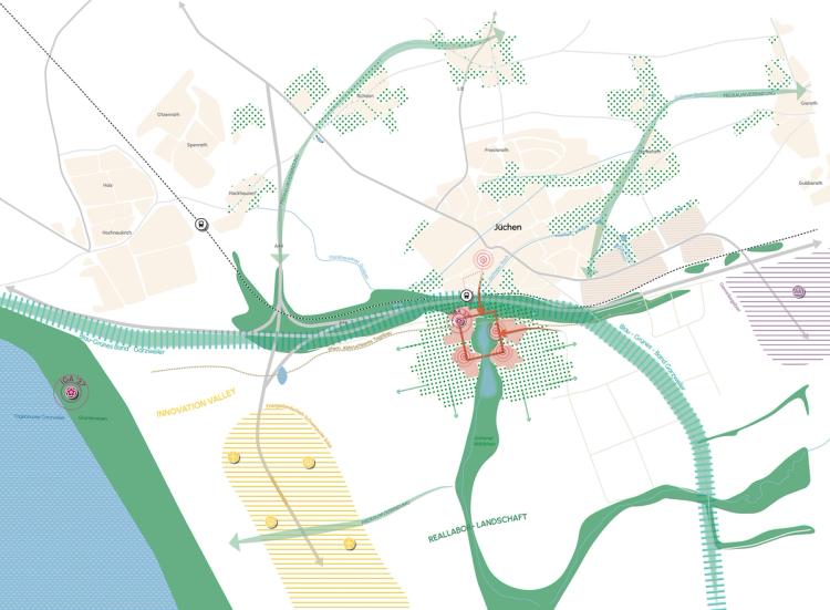 Für die Entwicklung Jüchen Süd wurde ein städtebauliches Konzept zur Transformation der ehemaligen Tagebaulandschaft Garzweiler erarbeitet. Die Neubesiedlung verstand sich nicht als konventionelle Stadterweiterung, sondern als bewusste räumliche Antwort auf die tiefgreifenden Eingriffe der Vergangenheit. Ziel war es, Verantwortung für die landschaftliche Ausbeutung zu übernehmen und daraus eine neue, zukunftsgerichtete Identität zu entwickeln.