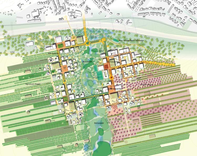 Das Quartier war als Reallabor für zirkuläres Bauen, Energiegewinnung und ressourcenschonende Produktionsweisen angelegt. Die enge Verzahnung von Wohnen, Arbeiten und produktiven Landschaftsräumen förderte soziale Vielfalt und neue Formen des Zusammenlebens. Ein offenes, poröses Grundraster ermöglichte Wandel, Wachstum und die kontinuierliche Weiterentwicklung des Quartiers unter sich verändernden Rahmenbedingungen.