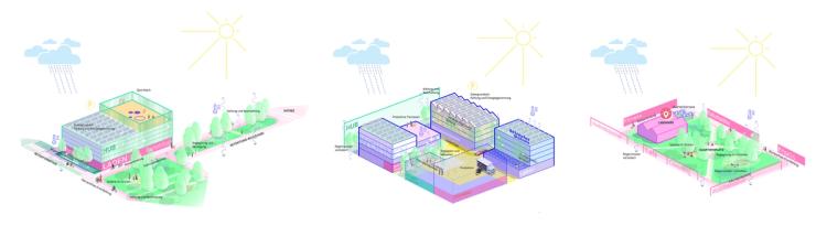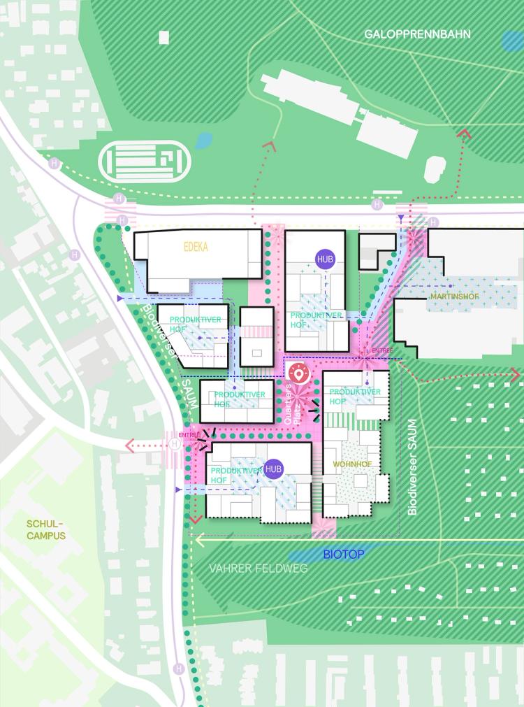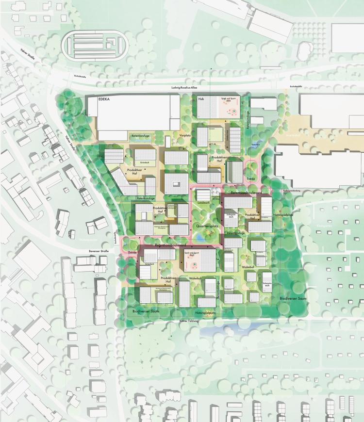Eine durchgängige blau-grüne Infrastruktur mit entsiegelten Flächen, Retentionsräumen und biodiversen Grünstrukturen erhöht die Klimaresilienz des Quartiers. Ein autoarmes Mobilitätskonzept mit kurzen Wegen, Mobility Hubs und einer klaren Priorisierung von Fuß- und Radverkehr unterstützt eine nachhaltige Entwicklung. Der Rahmenplan zeigt ein inklusives, langfristig transformierbares Quartier für unterschiedliche Lebens- und Arbeitsformen.