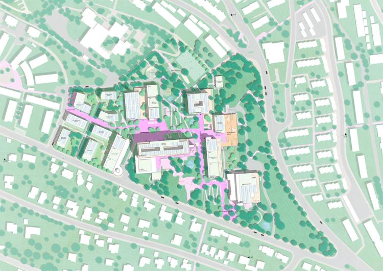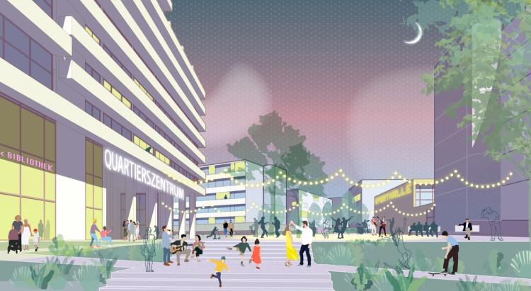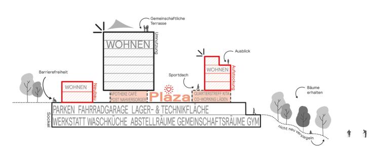 Ausgehend von fünf Leitbildern wird das Quartier bestandsorientiert entwickelt: Bestehende Strukturen werden weitergenutzt, Neuversiegelung weitgehend vermieden und durch Aufstockungen zusätzlicher Wohnraum geschaffen. Vorhandene Infrastrukturen und Grünräume bleiben erhalten und werden gezielt ergänzt. Ein Erschließungssystem mit zentraler Quartierspromenade stärkt die Durchwegung und schafft Aufenthaltsqualität.